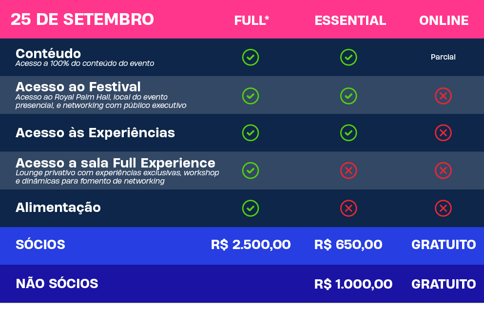 Além do acesso a todos os palcos, experiências e conteúdo do festival, você terá alimentação inclusa e acesso à sala Full Experience, lounge privativo que conta com: